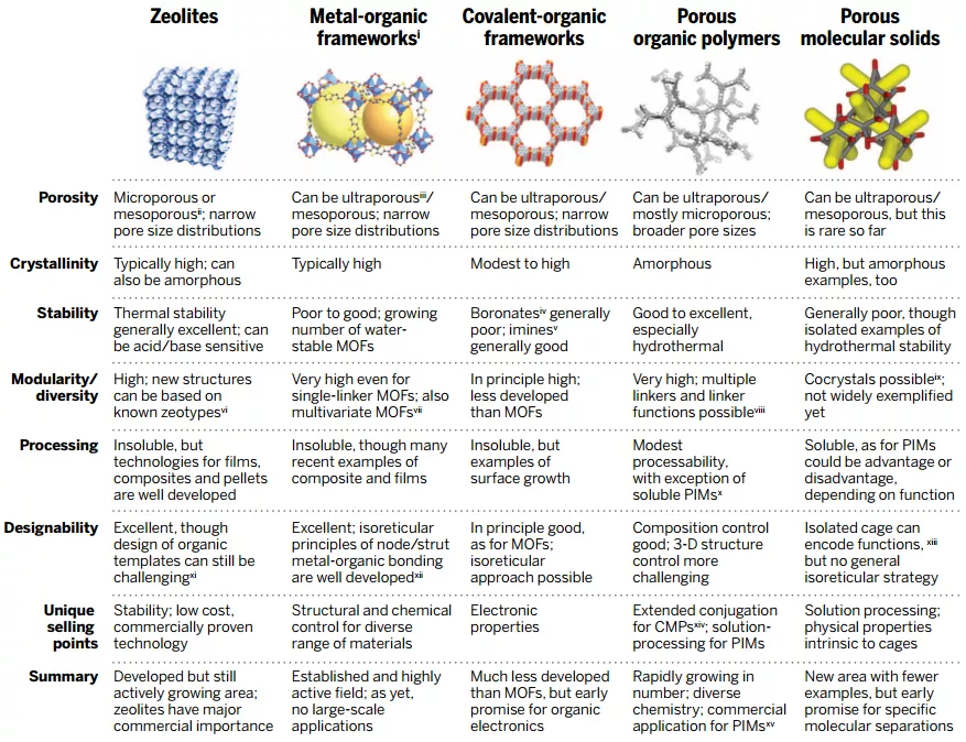 每个材料的相对优势都取决于具体的应用,所有这些性质都将与已确定的材料进行比较。考虑活性炭是另一种重要的多孔材料,此处未列入对比。