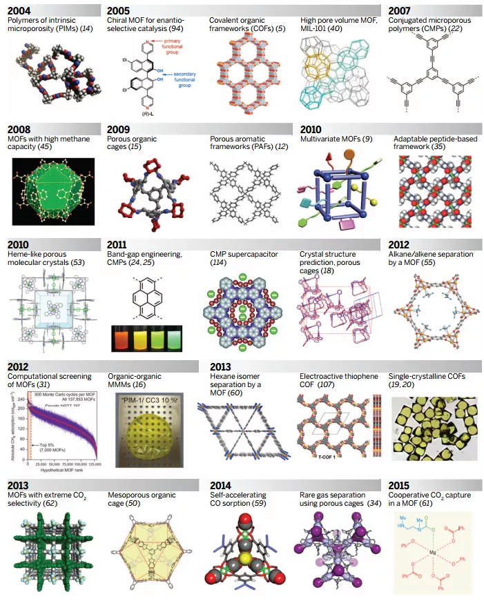 2005年,北卡罗来纳大学的C. D. Wu等人报道了手性MOF用于对映选择性催化结构。密歇根大学的A. P. Côté等人报道了共价有机框架(COF)结构。凡尔赛大学圣奎因伊夫林分校的G. Férey等人报道了高孔隙率MOF结构。