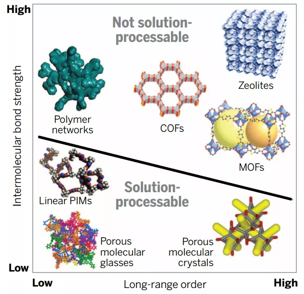 对多孔材料进行分类的方法很多,其中一种方法是通过其远程有序程度及其分子间键合强度来分类,这些参数会影响多孔材料的具体性能。譬如,远程有序程度在分子筛应用中可能有用,而强大的分子间键则可以促进化学或热稳定性。